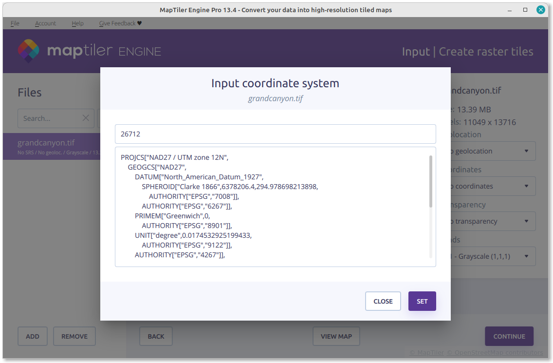 MapTiler Engine detects the coordinate system automatically. If it’s not possible, you’ll be prompted to set it manually.