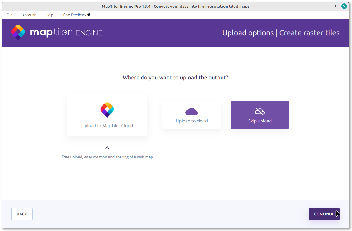 In the next page you select where you’d like to upload your tileset. MapTiler Cloud is the first and recommended option (described here). If you wish to save your data only locally, or upload it later, select “Skip upload”.