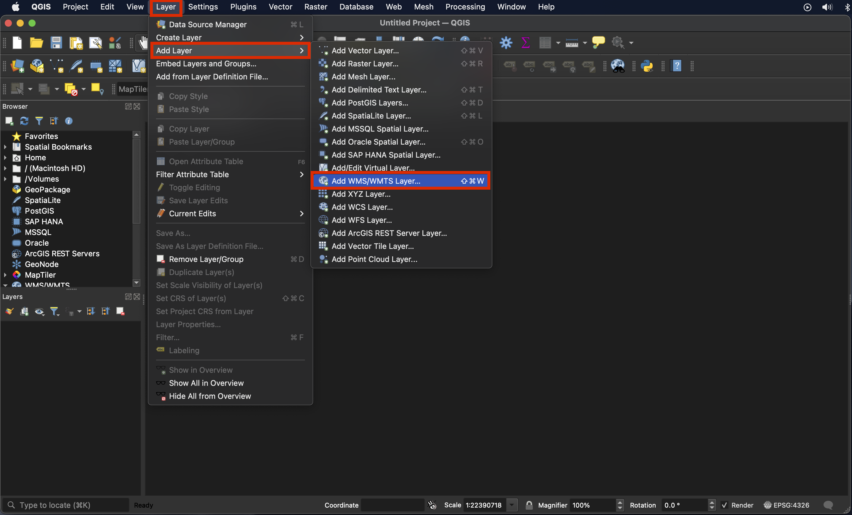 In QGIS, add a new WMS/WMTS layer (from the right menu, by navigating to “Layer” -> “Add Layer” -> “Add WMS/WMTS Layer…”, or by using Ctrl+Shift+W shortcut).