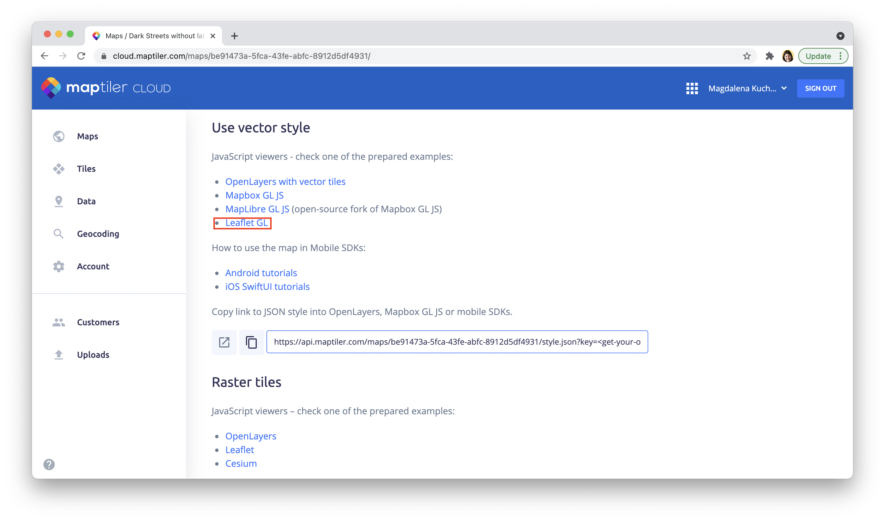 First, we will need to add a tile layer with labels. Go to MapTiler Cloud and select your label map (all other layers are turned off). Under Raster tiles, select Leaflet. From sample code, copy var map and place it between basemap code and Gadd GeoJSON code.