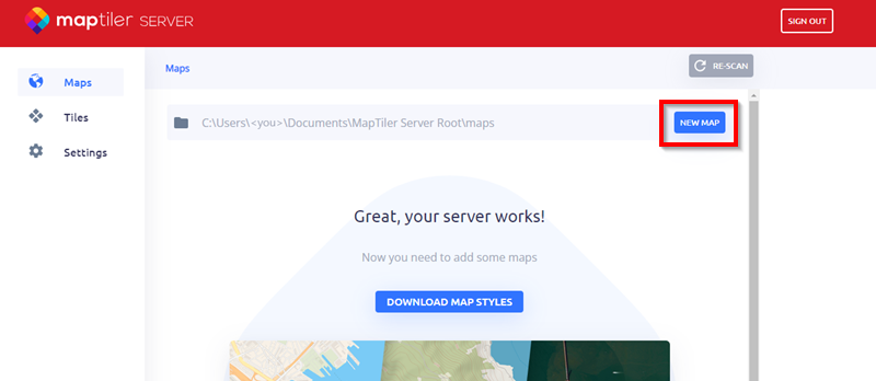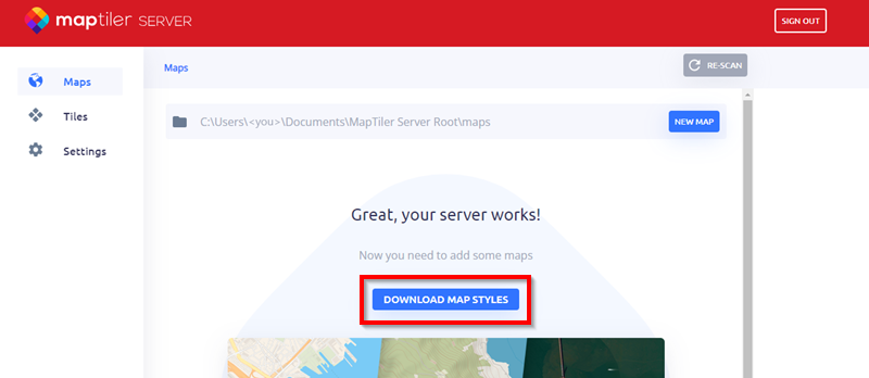 Once you install MapTilerServer and sign in, you see the main page of MapTiler Server and are ready to host a map.