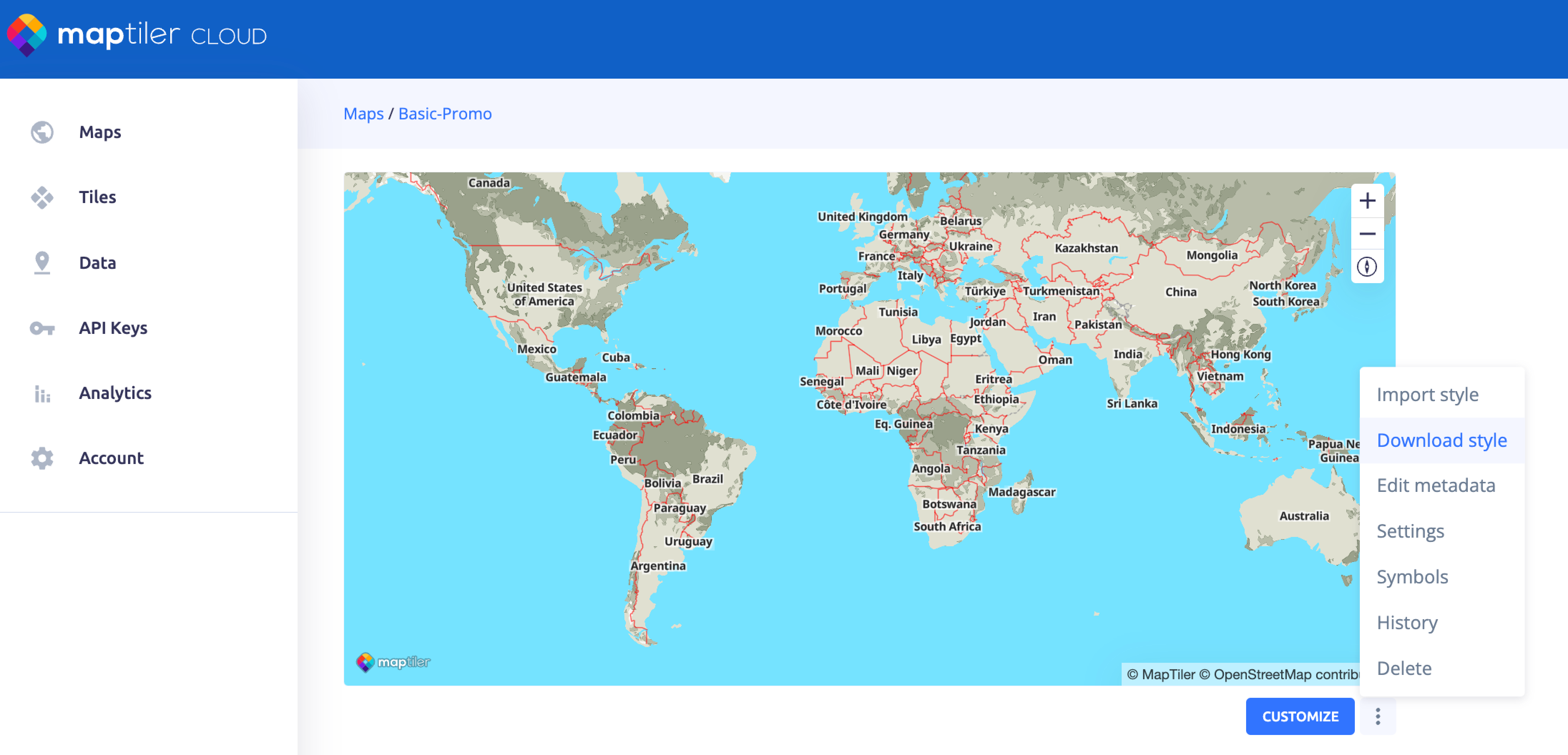 This article shows how to export custom map styles from MapTiler Cloud and how to work with these custom styles in MapTiler Server. Map styles generated in MapTiler Cloud are specific and use some resources that are usually not available in the air-gapped environment of MapTiler Server. Therefore some adjustments to the style are usually required. This article will give all the necessary information about the adjustment and deployment process for your custom map styles.